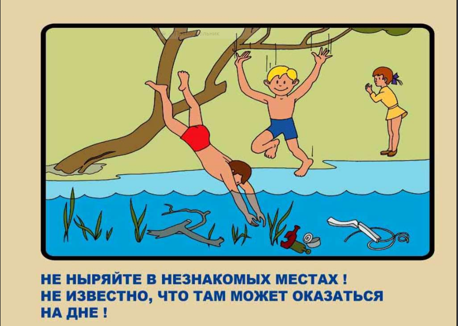 - запрещено купаться (нырять) в необорудованных и незнакомых местах;