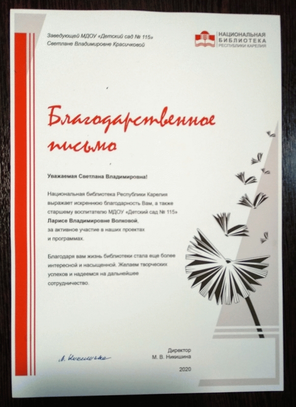 Уважаемые педагоги, родители, воспитанники МДОУ "Детский сад № 115", мне посчастливилось принять слова благодарности в ваш адрес от руководителя и специалистов НБ РК.