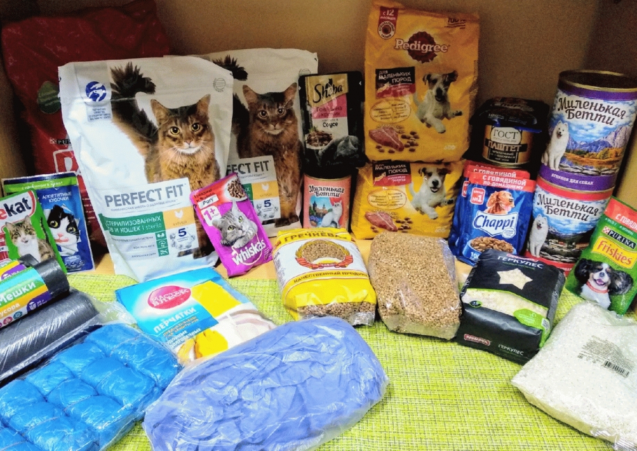 Наша традиционная акция "Из ладошки в лапку" передала куратору Александре Суховой: 40 кг круп, 18 кг сухих кормов, 60 пакетиков жид.корма, корма в банках, а т.ж. ветошь и моющие средства.